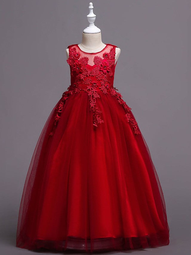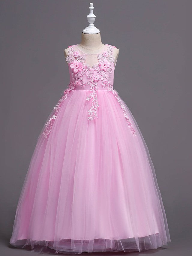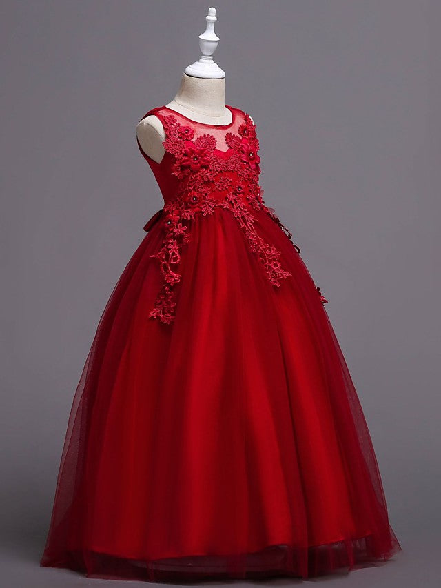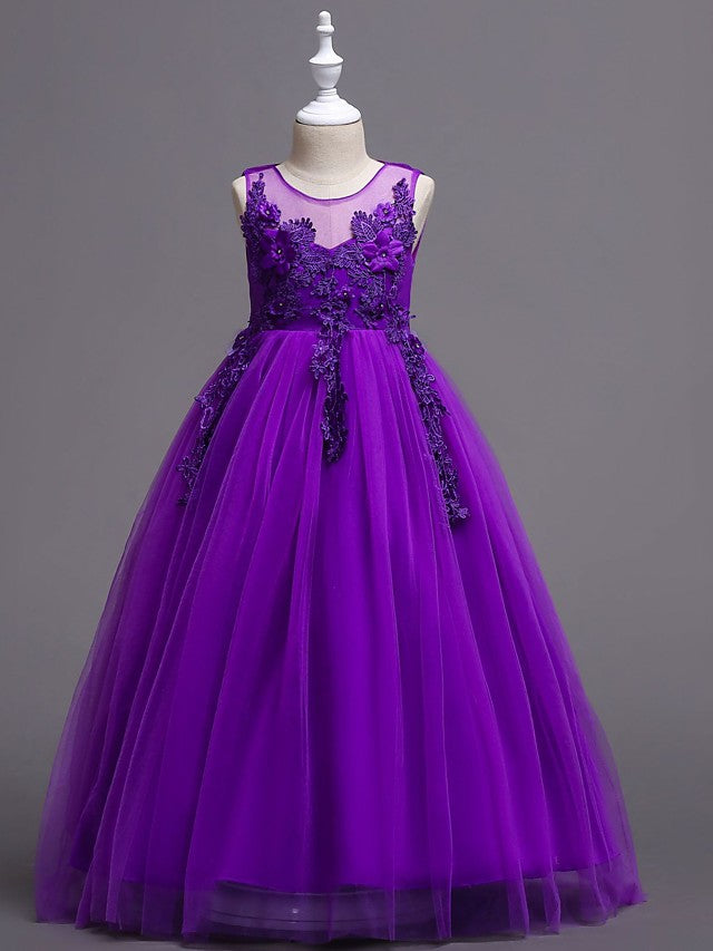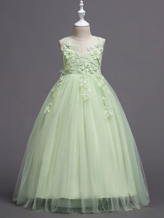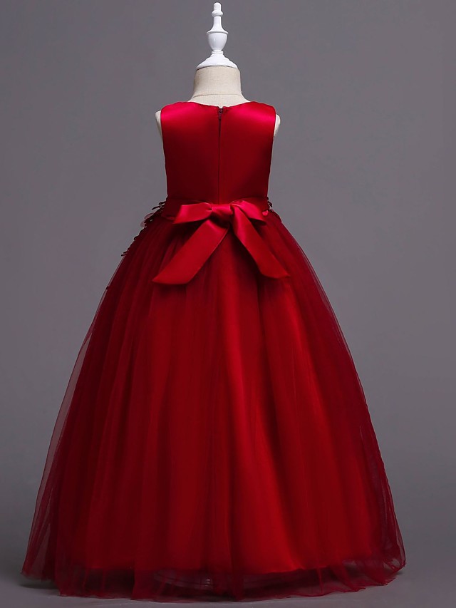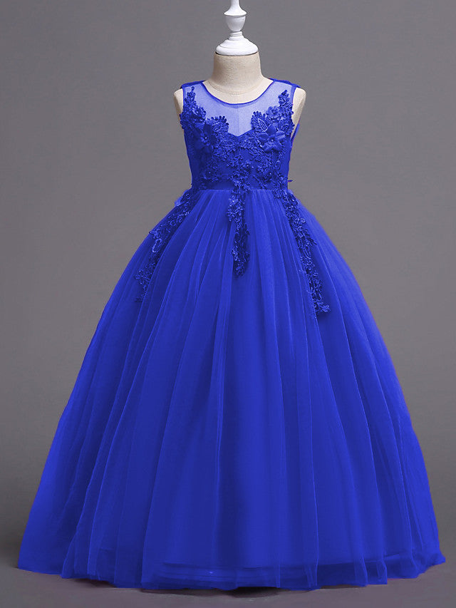 Long Princess Satin Tulle Jewel Neck Wedding First Communion Flower Girl Dresses