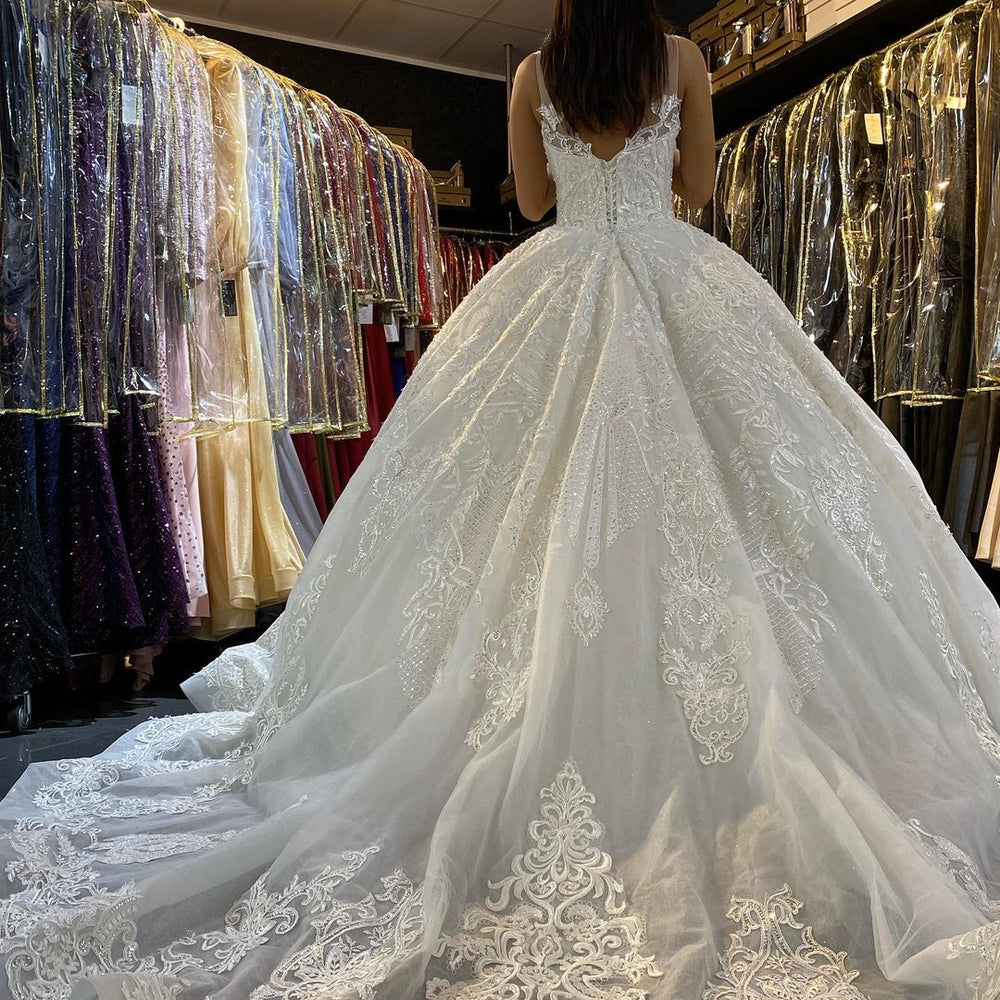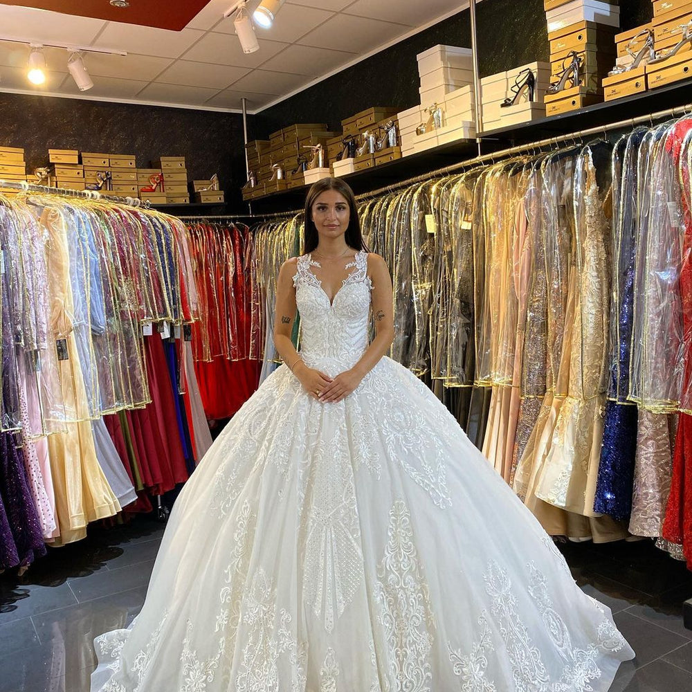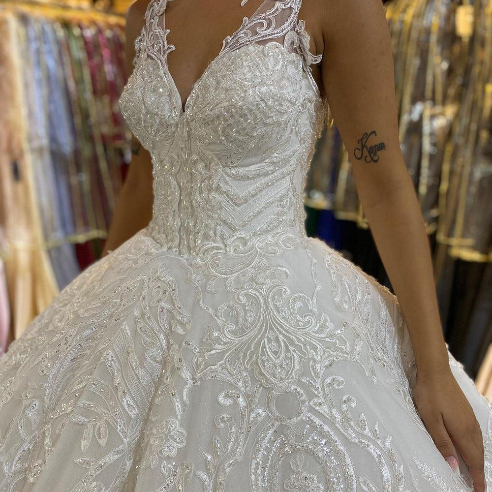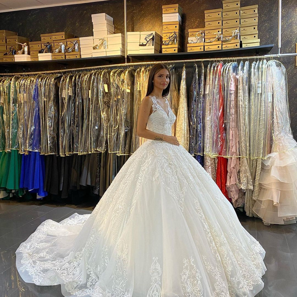 Long Princess V-neck Appliques Lace Backless Wedding Dress