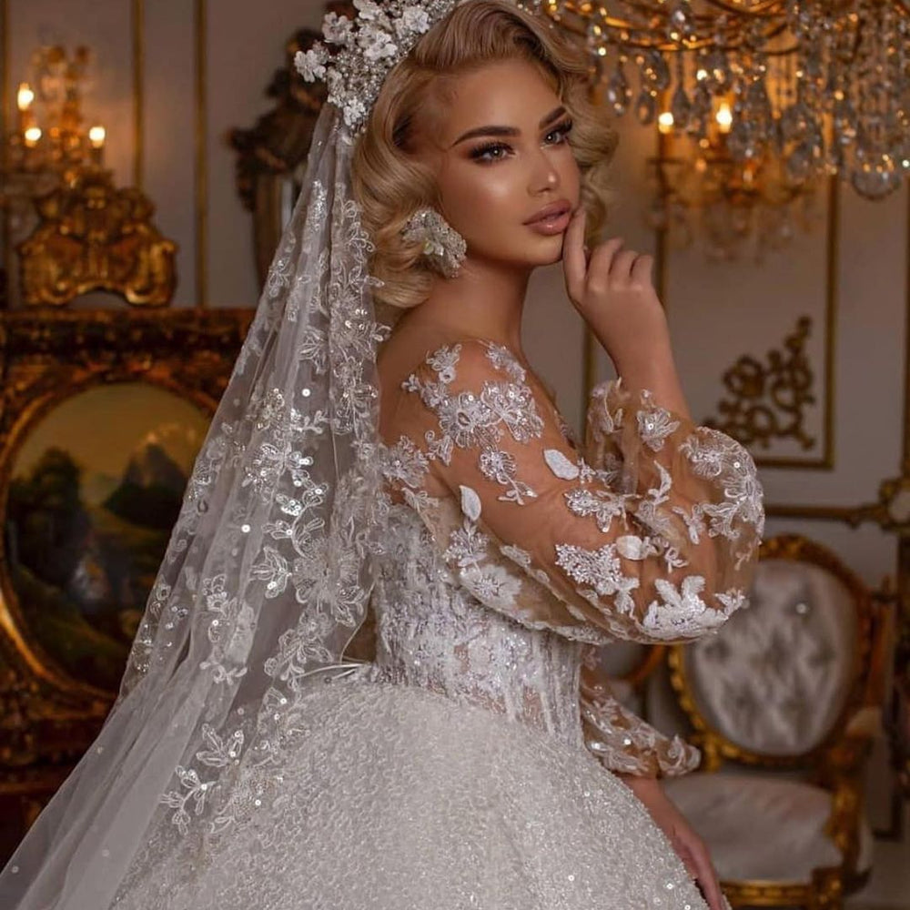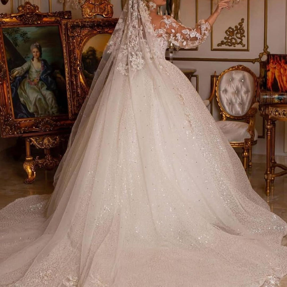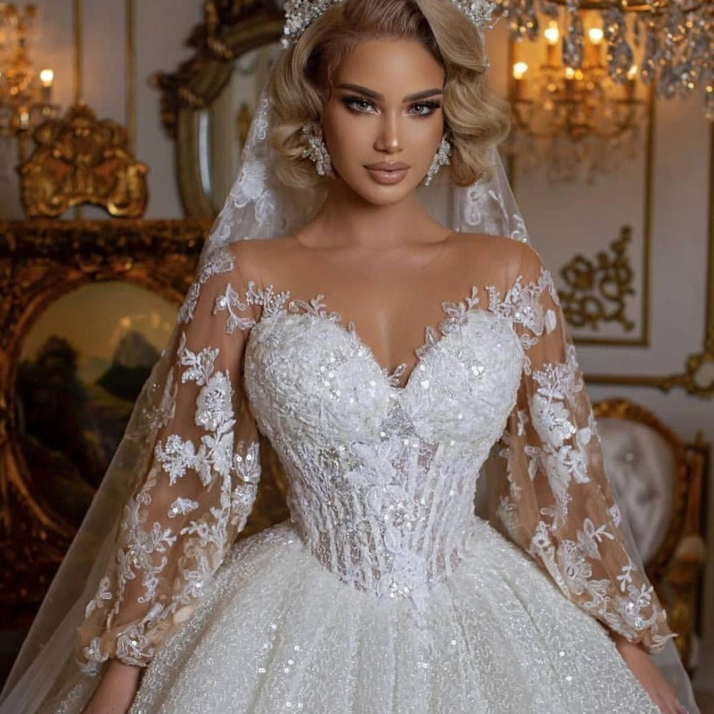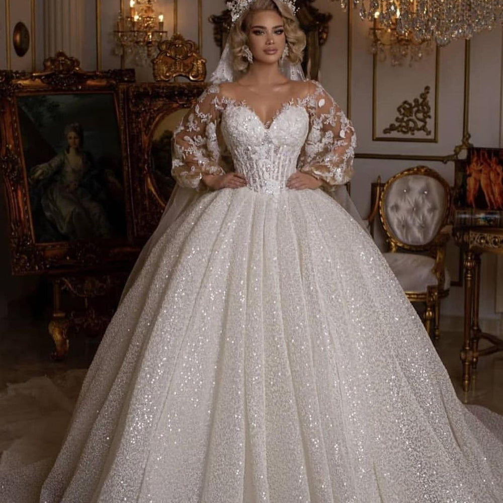 Luxury Long Ball Gown Glitter Wedding Dress with Puffy Sleeves