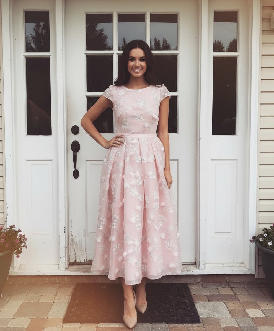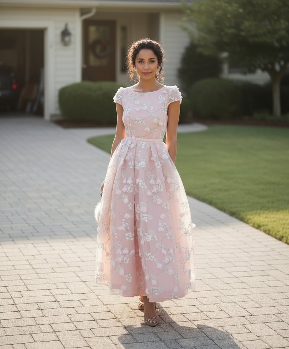 Pink Short Flowers Jewel A-Line Tea-length Prom Dresses