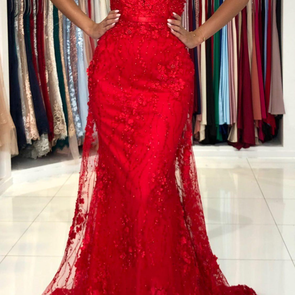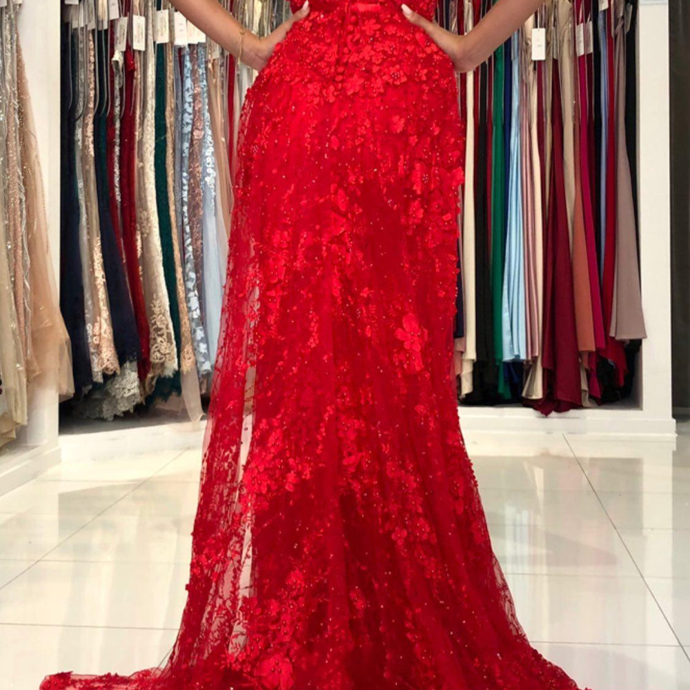 Red Long Mermaid V-neck Spaghetti Straps Backless Lace Prom Dress