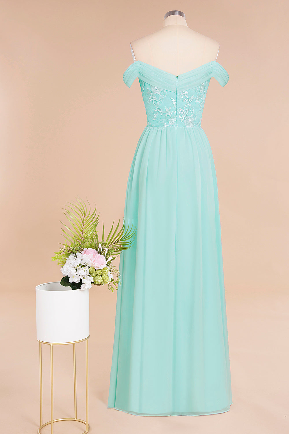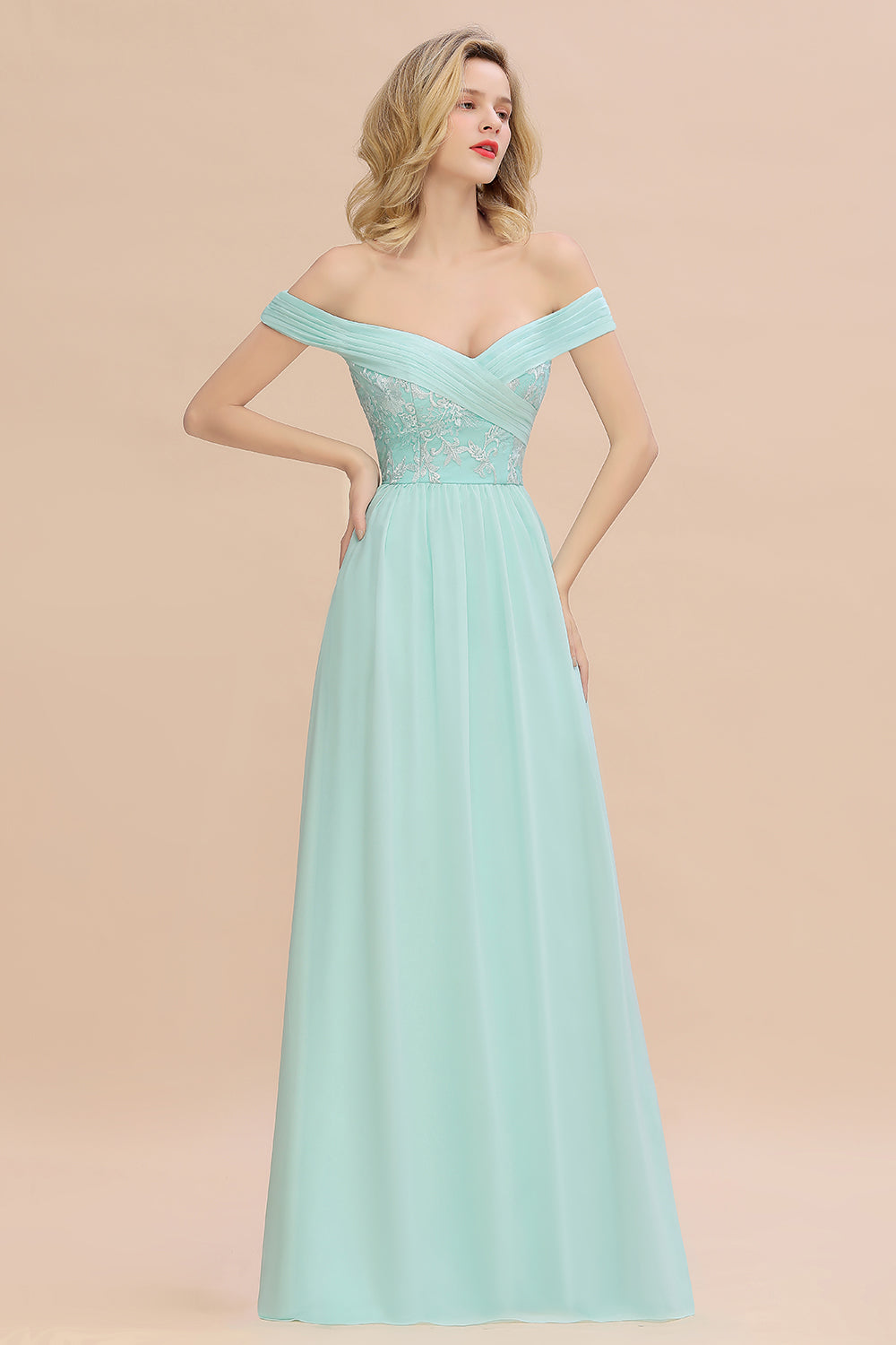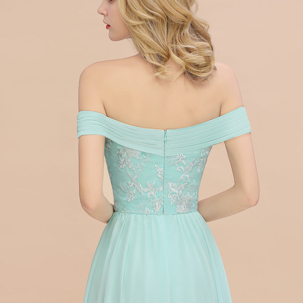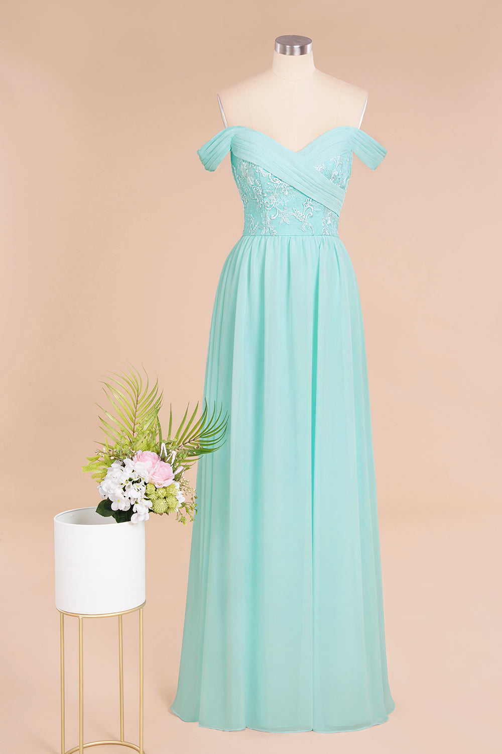 Simple Long A-line Ruffles Off-the-shoulder Bridesmaid Dress with Appliques Lace