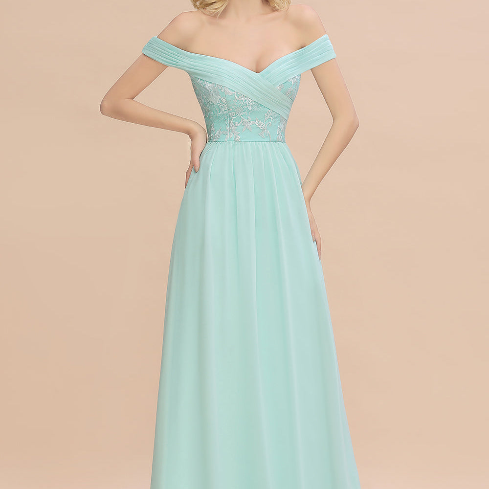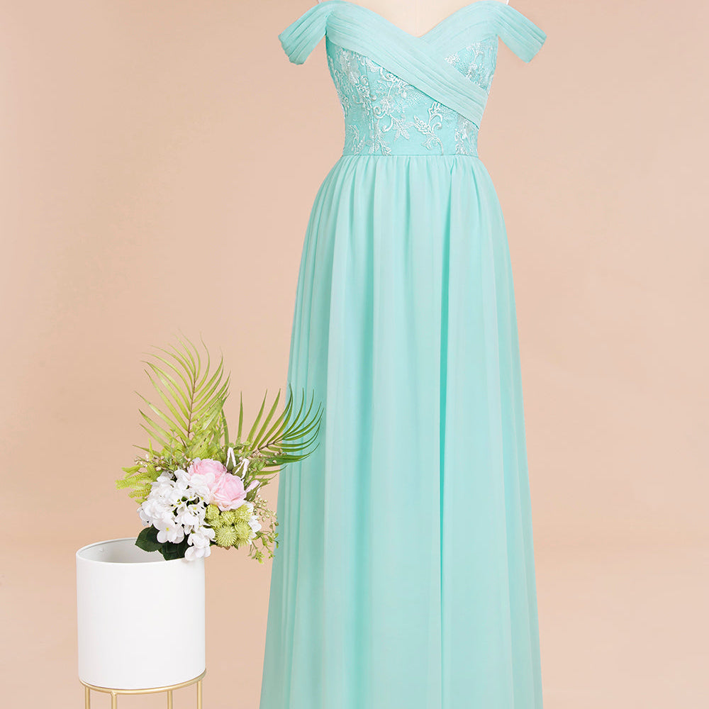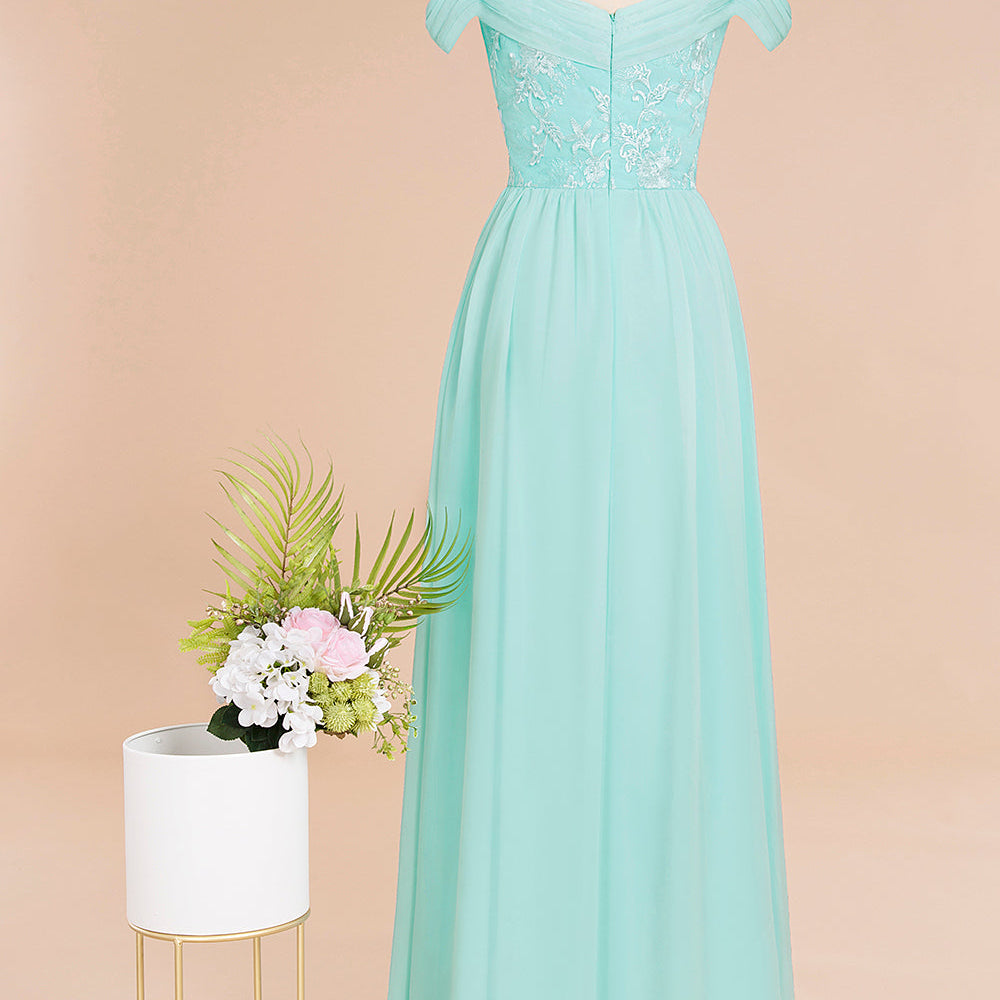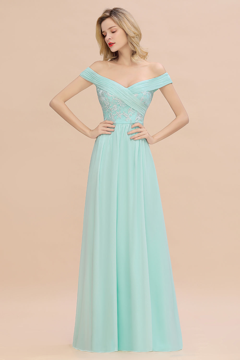 Simple Long A-line Ruffles Off-the-shoulder Bridesmaid Dress with Appliques Lace