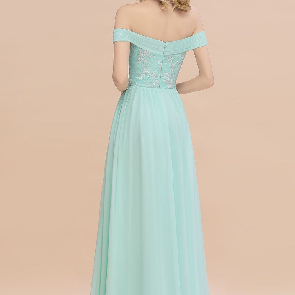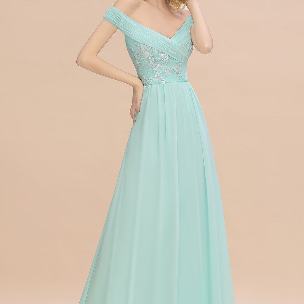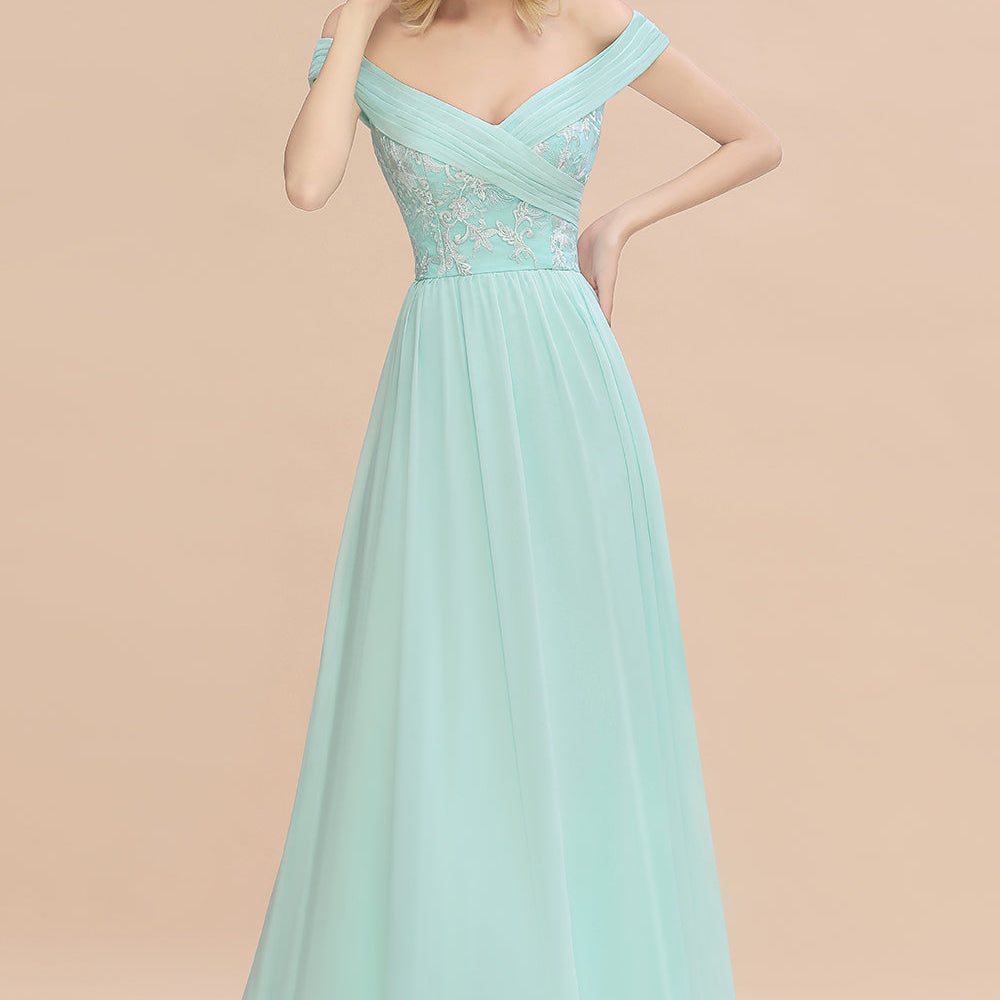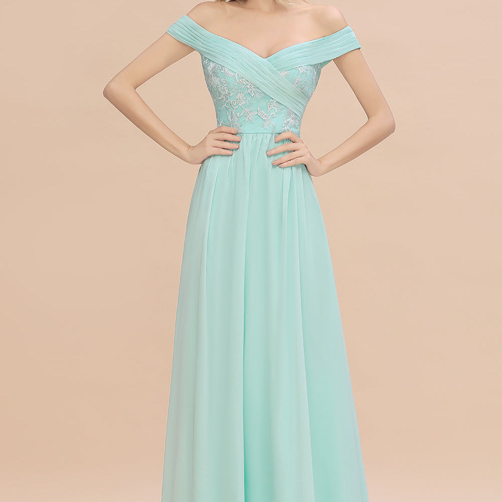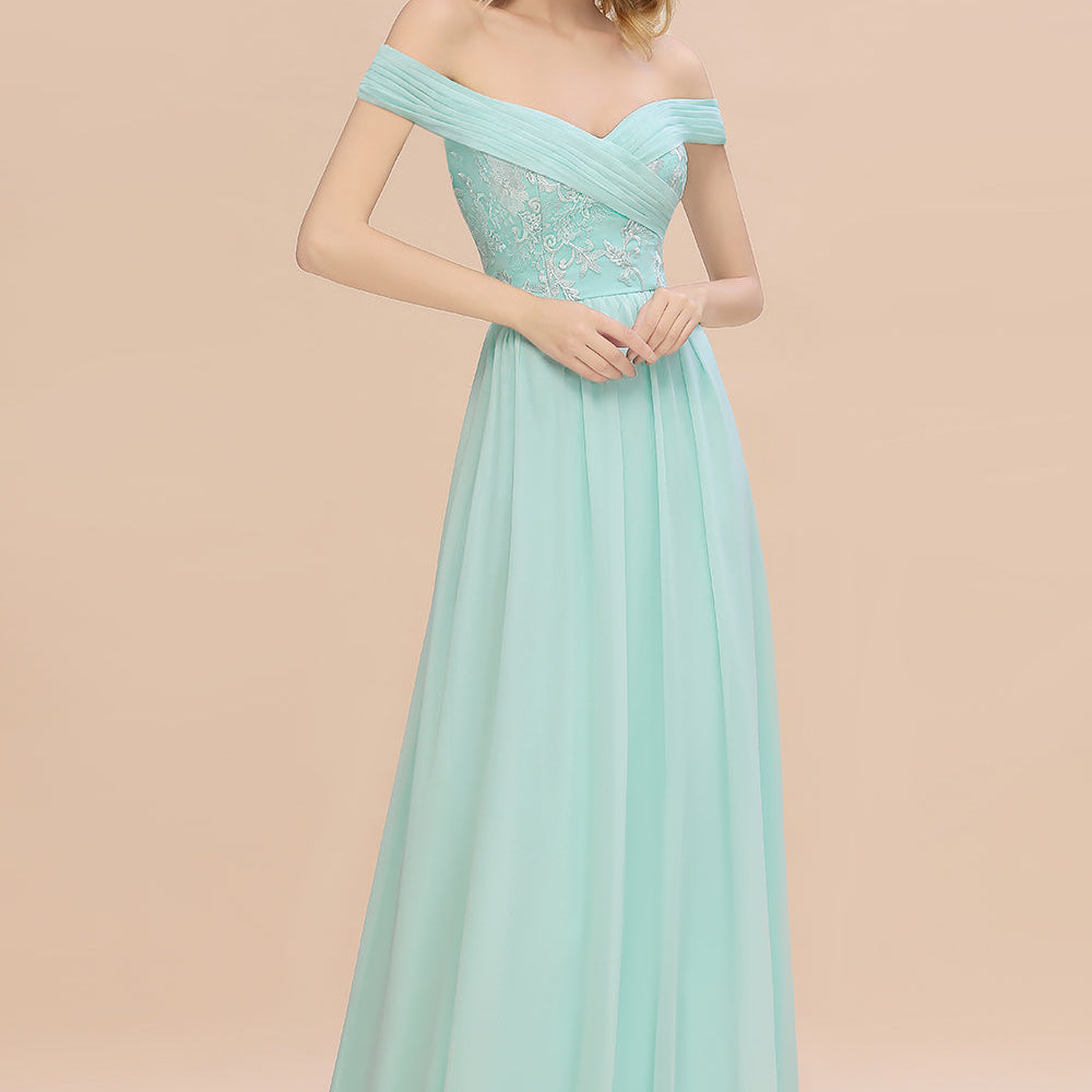 Simple Long A-line Ruffles Off-the-shoulder Bridesmaid Dress with Appliques Lace