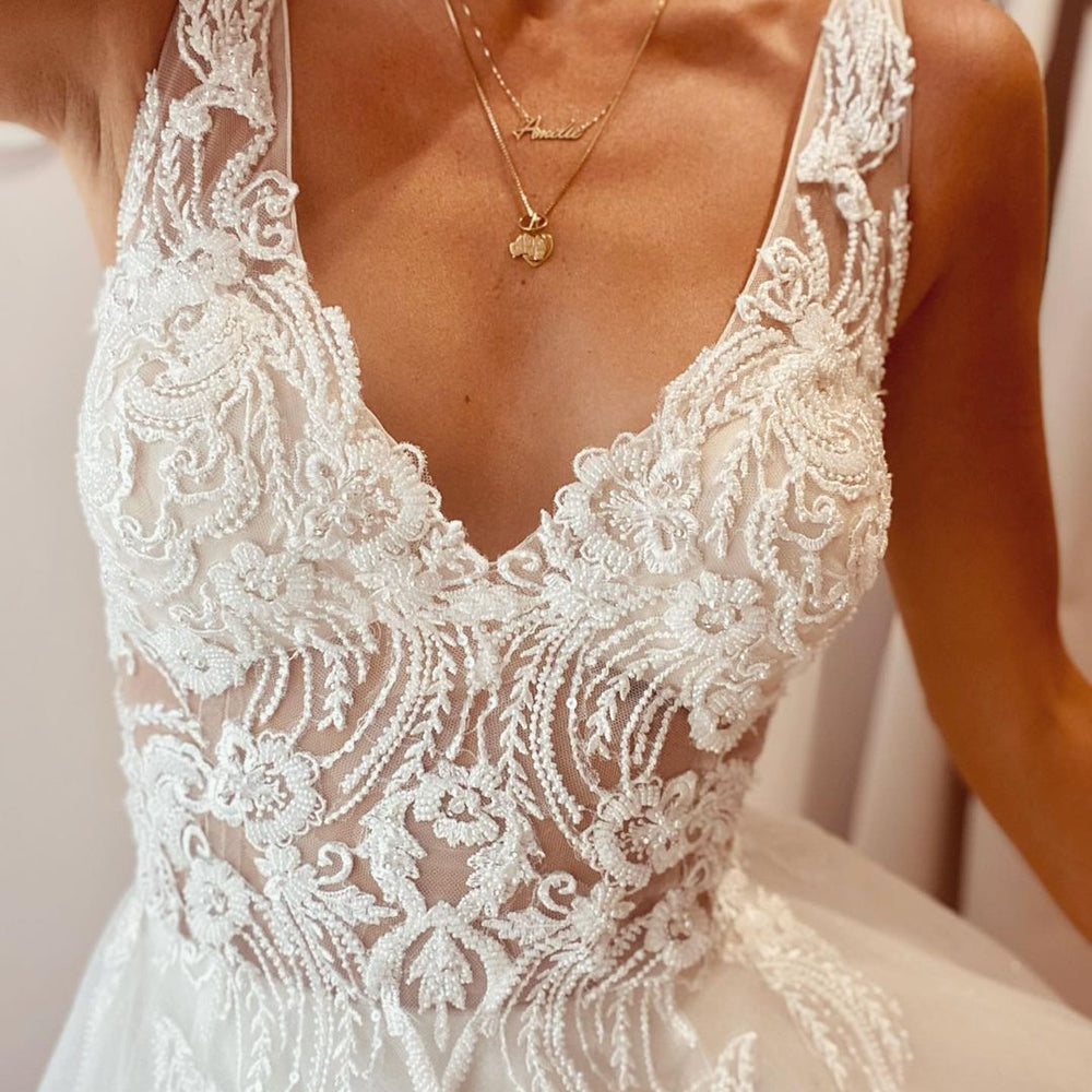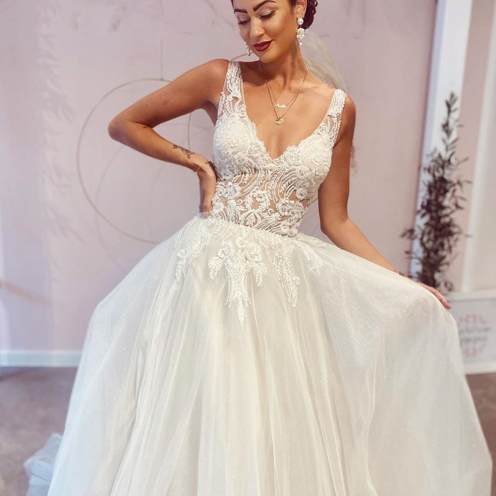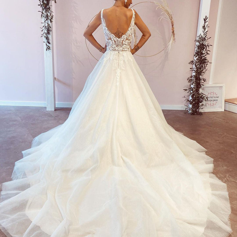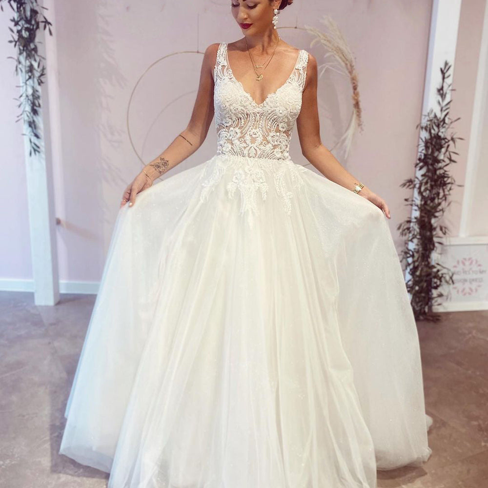 Stunning Long A-Line V-neck Backless Wedding Dress With Appliques Lace